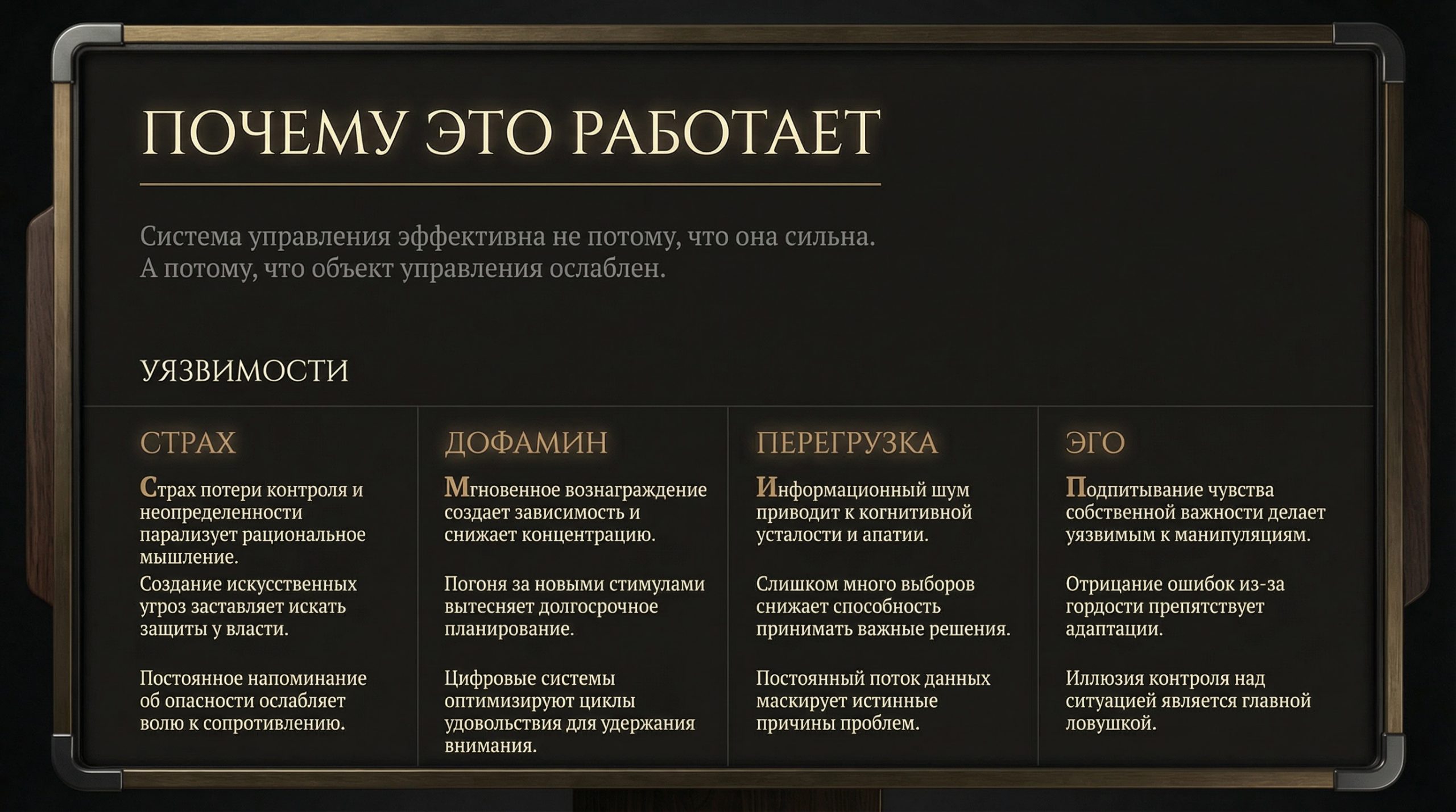 Как устроена система, производящая хаос. Механизмы контроля. Технологии подмены реальности. Почему человек уязвим.понимание того, почему «всё так» и откуда берутся психологические проблемы. Не в терминах популярной психологии, а на уровне архитектуры. Когда механизм виден — он перестаёт работать вслепую.