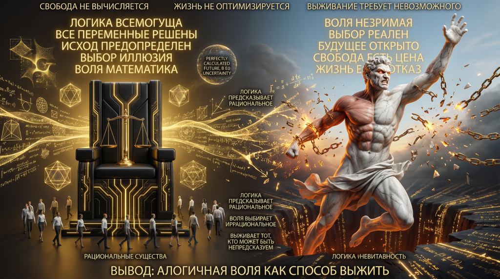- Сценарий Б (Разрыв): Человечество выбирает Алогичную волю. Мы отказываемся от комфорта и безопасности ради сохранения статуса «субъекта». Мы культивируем в себе то, что машина не может симулировать — способность к абсурдному самопожертвованию, к немотивированному творчеству, к вере. Это путь войны, страданий и хаоса, но это единственный путь остаться живыми в экзистенциальном смысле.