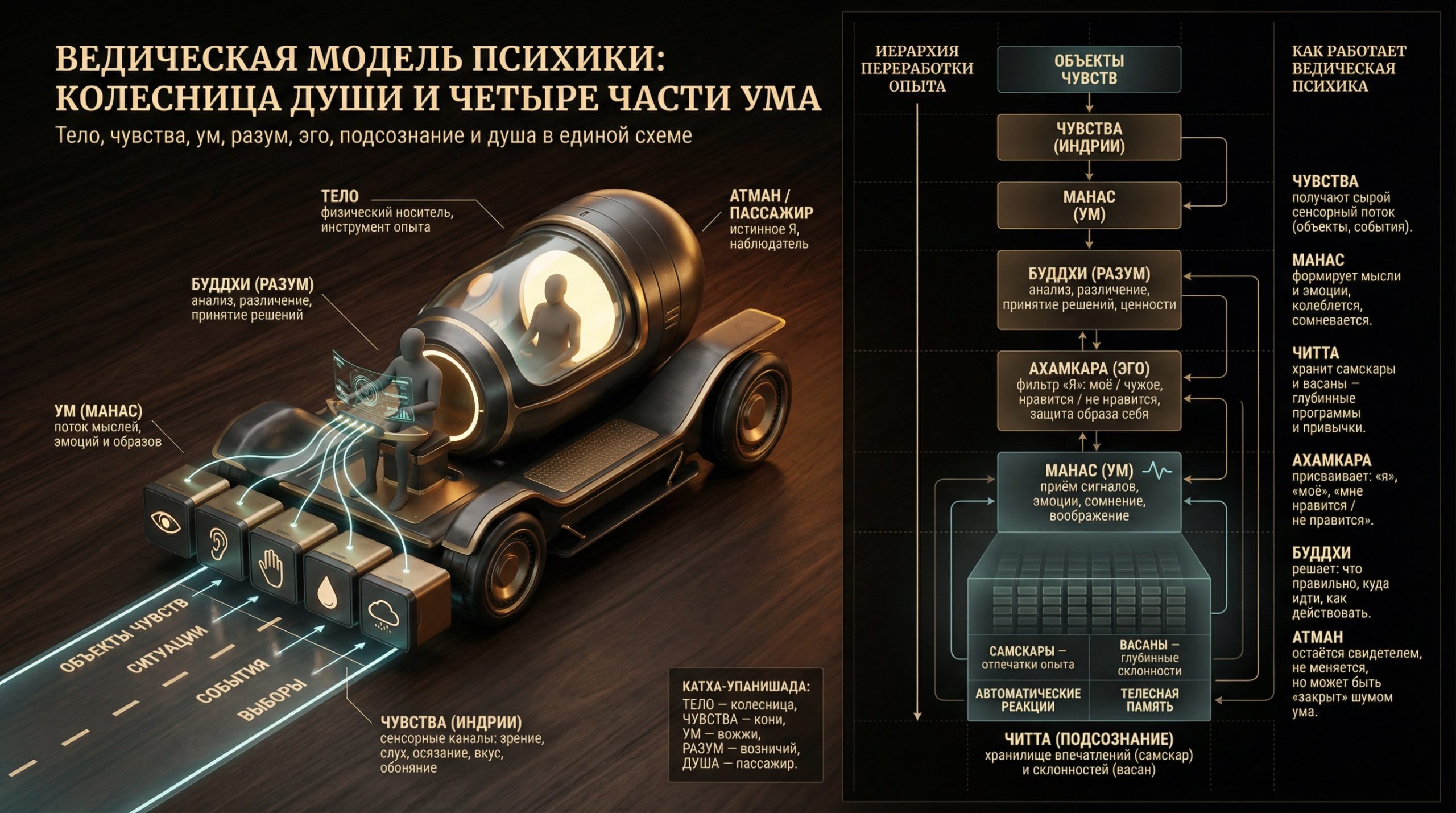 — Модель колесницы: древний чертёж внутреннего управления — Научный контекст: что нейронаука и психология могут и не могут объяснить — Три уровня управления: Эго, Разум, Истинное Я — Почему «саморазвитие» имеет потолок — и как его преодолеть — Психическое Существо: что это, как его услышать — Карта эволюции: от фрагментации к целостности