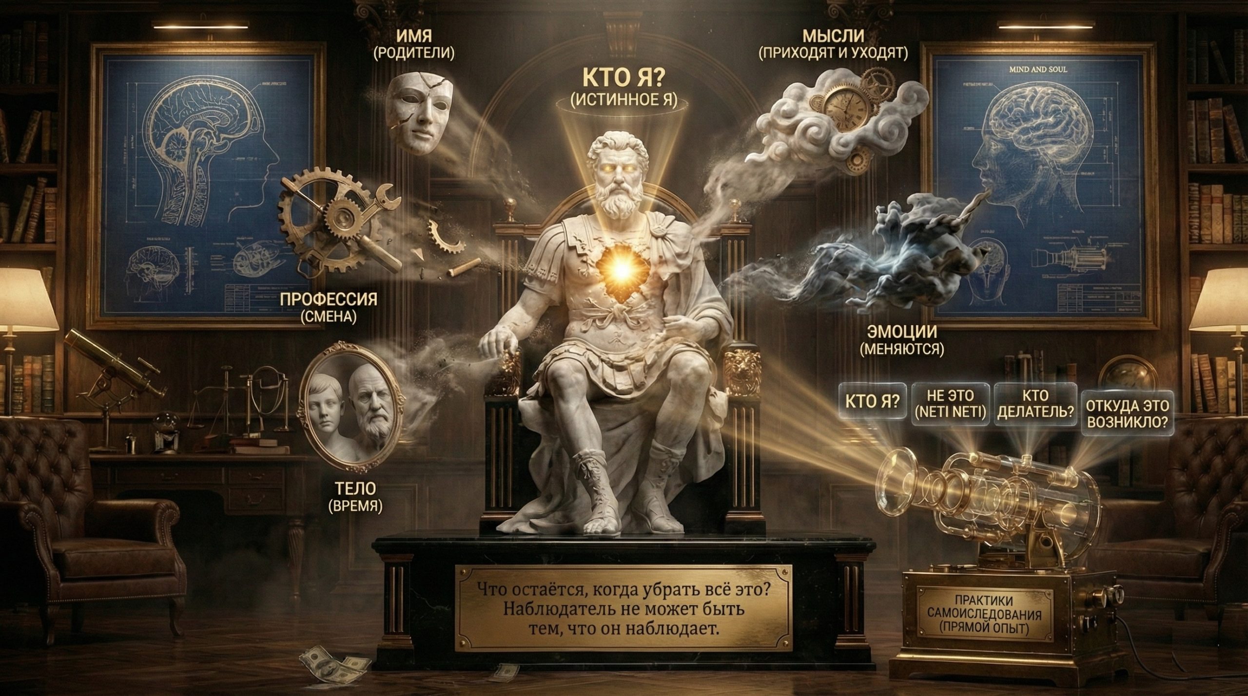 Суть: любое определение, которое вы даёте себе, — ложно. Вы — не тело, не профессия, не роль, не репутация, не мысли, не эмоции. Всё это — то, чем вы обладаете или что переживаете, но не то, чем вы являетесь.