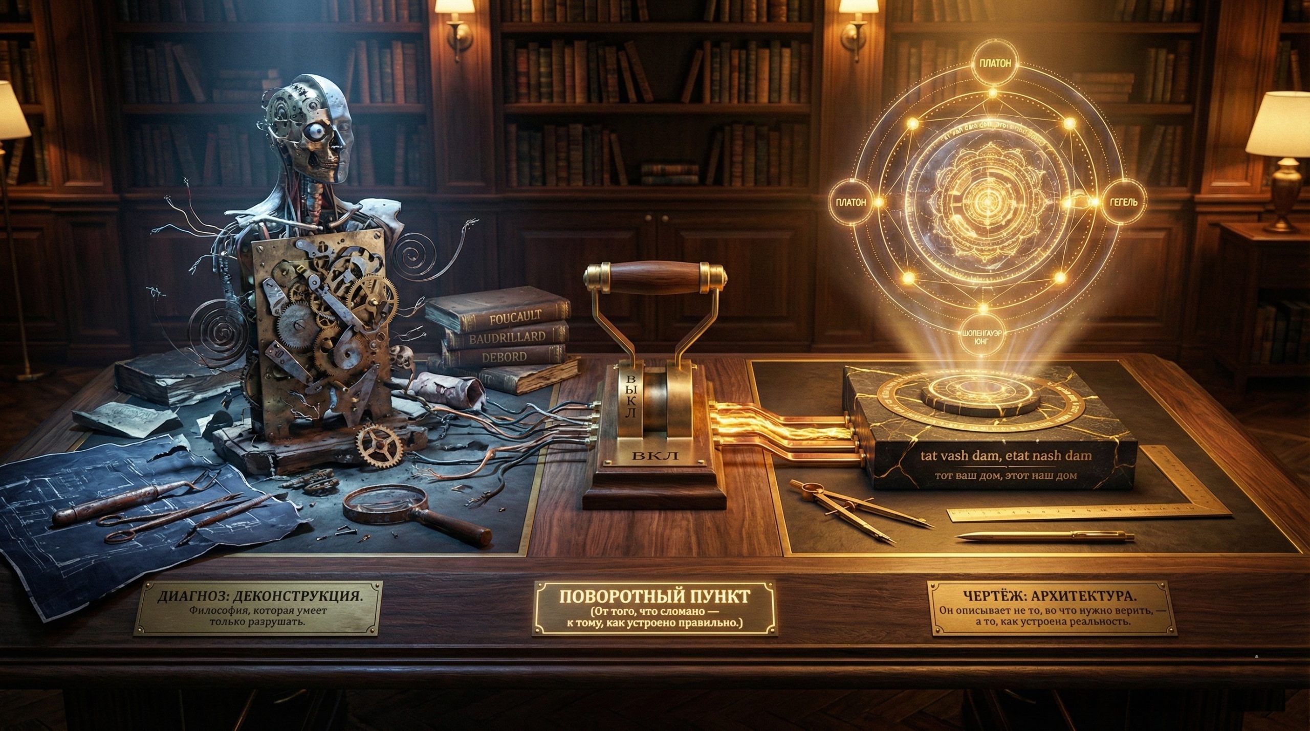 Западная мысль достигла совершенства в анализе и деконструкции. Фуко, Дебор, Бодрийяр — блестящие диагносты. Они научились разбирать любую конструкцию на части, находить противоречия, срывать маски. Но они не могут строить. Философия, которая умеет только разрушать, — это половина философии.